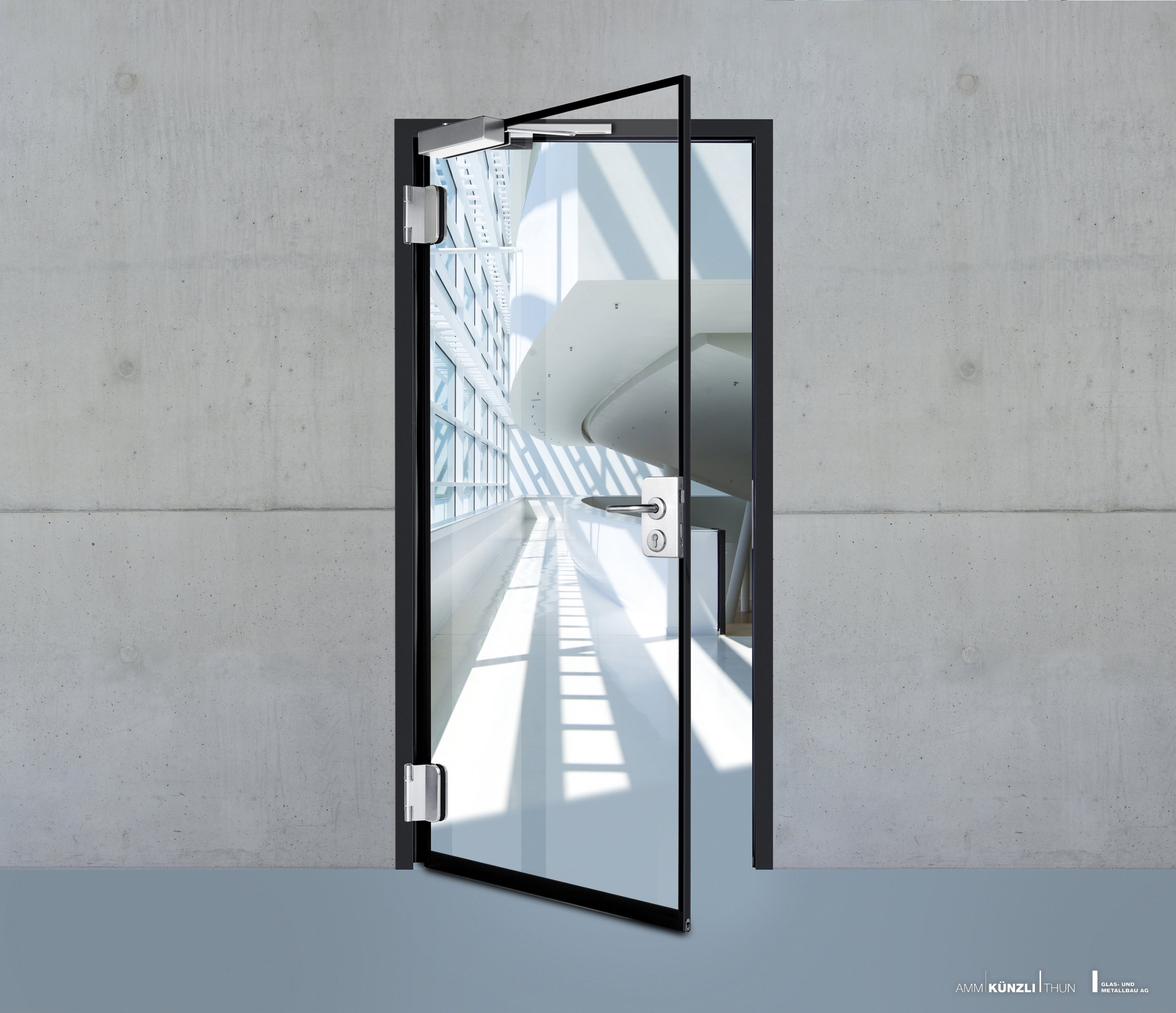 Kompromisslos auch in den Details. Die Ganzglas-Brandschutztüre ist in 1- und 2-flügliger Version lieferbar, übernimmt dank integrierter absenkbarer Bodendichtung auch die Rauchschutz-Funktion und besticht durch zeitlos elegante Beschläge aus Edelmetall.