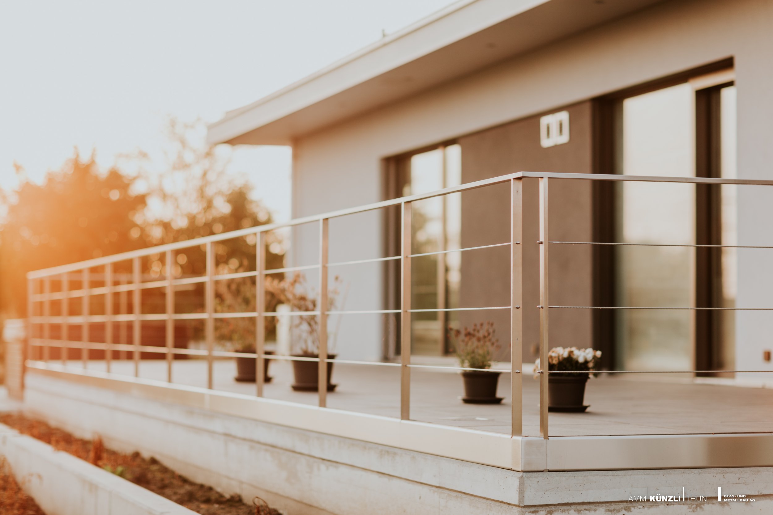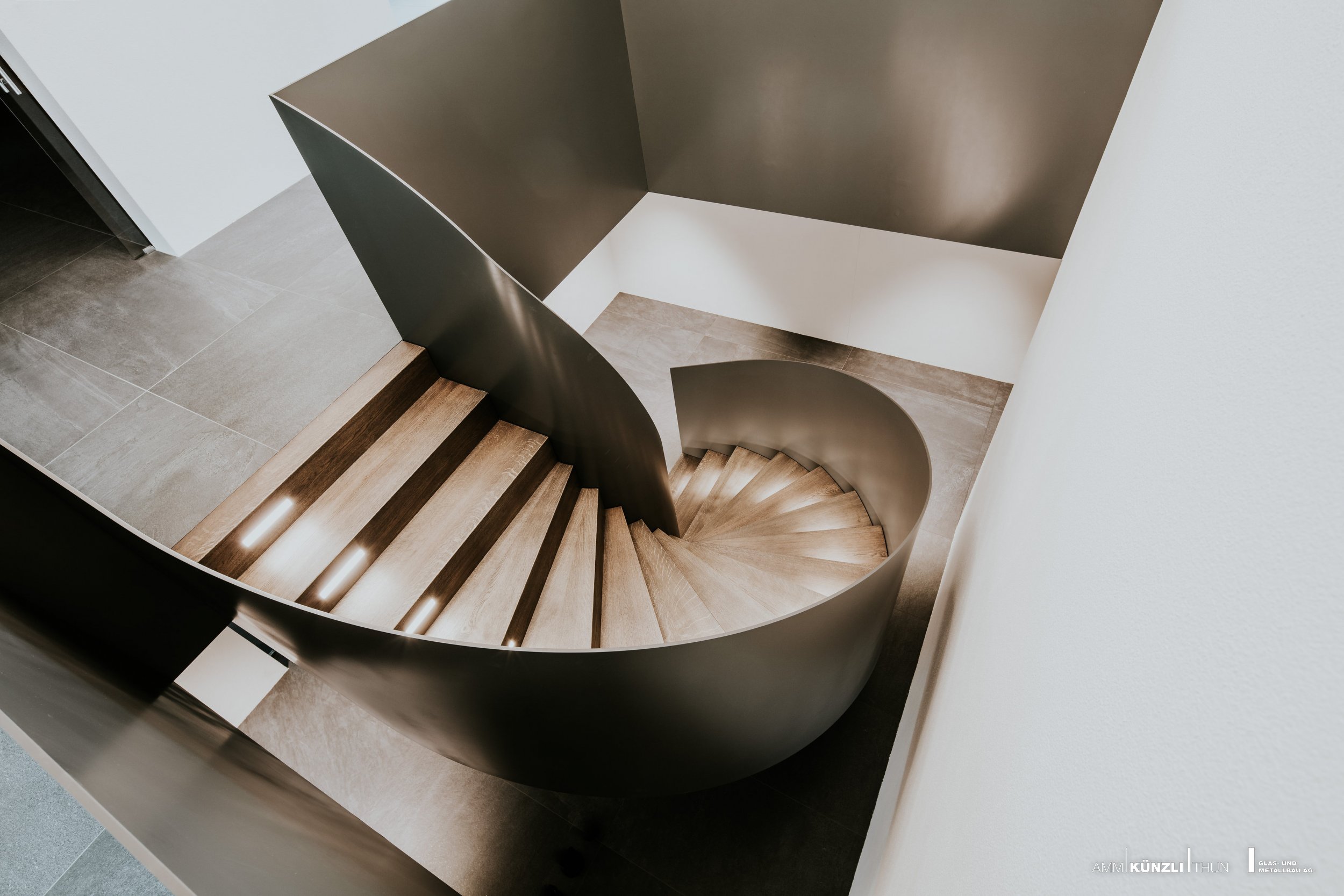 Geschwungene Treppe aus Metall als Augenweide im Zentrum des Hauses oder imposante Eingangsfront.